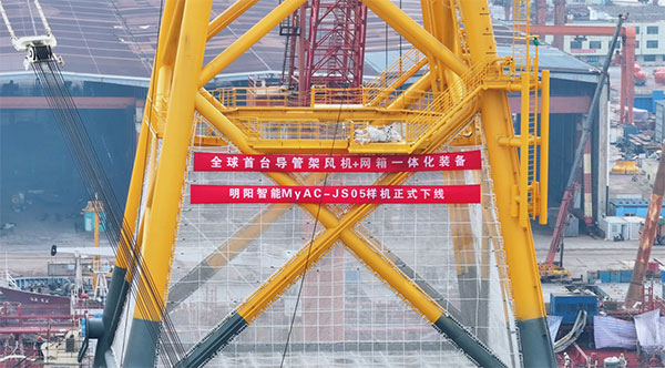 近日,由明陽智能自主研發(fā)設(shè)計的“導管架風機+網(wǎng)箱”風漁融合一體化裝備MyAC-JS05在浙江舟山正式下線,預計于7月下旬投運于“海上風電+海洋牧場+海水制氫”融合項目明陽陽江青洲四海上風電場項目。