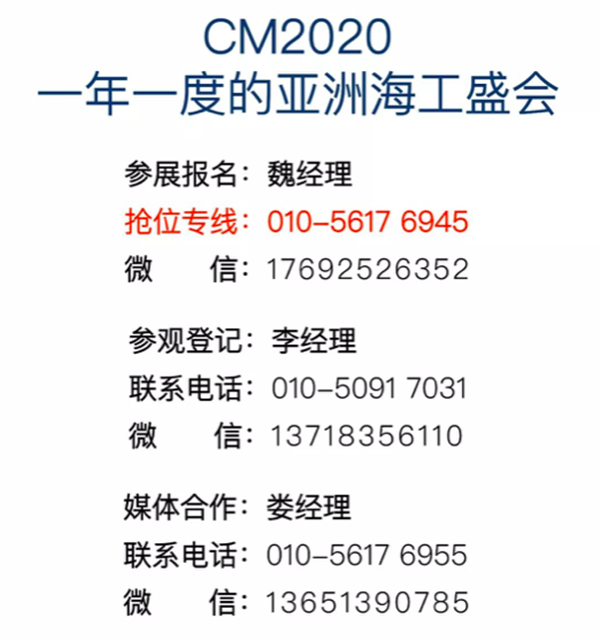 2020年7月3日-5日,第十屆北京國際海洋工程技術(shù)與裝備展覽會(CM2020),將在北京·中國國際展覽中心(新館)舉辦。屆時,CM2020將搭建船海裝備展示交流大平臺,來自全球65個國家和地區(qū)的1800家展商將薈聚北京,與120000專業(yè)觀眾一道,共襄一年一度的亞洲海工盛會。