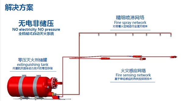 專門(mén)針對(duì)大型機(jī)械發(fā)動(dòng)機(jī)等高溫區(qū)域開(kāi)發(fā)的無(wú)電非儲(chǔ)壓式的自動(dòng)滅火系統(tǒng),采用航天固體動(dòng)力技術(shù),結(jié)合先進(jìn)的水基滅火劑,實(shí)現(xiàn)長(zhǎng)期穩(wěn)定運(yùn)行,無(wú)壓無(wú)電,安全可靠的滅火裝置。