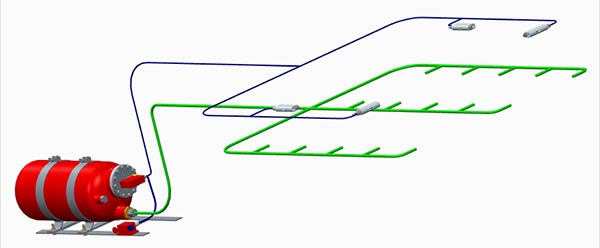系統(tǒng)由罐體裝置 、手動(dòng)觸發(fā)器 、感溫探火管路 、藥劑噴灑管路 、高壓霧化噴頭 、火源自動(dòng)探測(cè)器、信號(hào)反饋裝置 及部分接頭附件組成。無(wú)火情時(shí),系統(tǒng)完全處于零壓狀態(tài),包括藥劑罐內(nèi)滅火藥劑也以無(wú)壓液體形式存在?;鹎榘l(fā)生后,在火源自動(dòng)探測(cè)器感溫原件被觸發(fā),迅速產(chǎn)生高壓氣體傳導(dǎo)至罐體并觸發(fā)產(chǎn)氣組件內(nèi)固體產(chǎn)氣劑反應(yīng)產(chǎn)生大量高壓氣體,高壓氣體推動(dòng)灌內(nèi)藥劑,將其通過(guò)管路和噴頭噴灑出去,迅速湮沒(méi)受保護(hù)的空間,覆蓋、降溫并隔絕空氣,實(shí)時(shí)火情抑制,撲滅火情。
